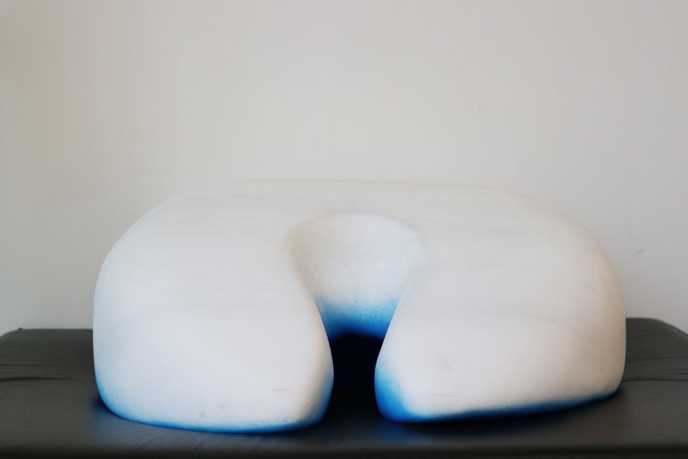 (Rachel is sitting in a sofa, which is already a part of the architecture of ARoS. As a spectator it is possible to sit down beside her and touch her).